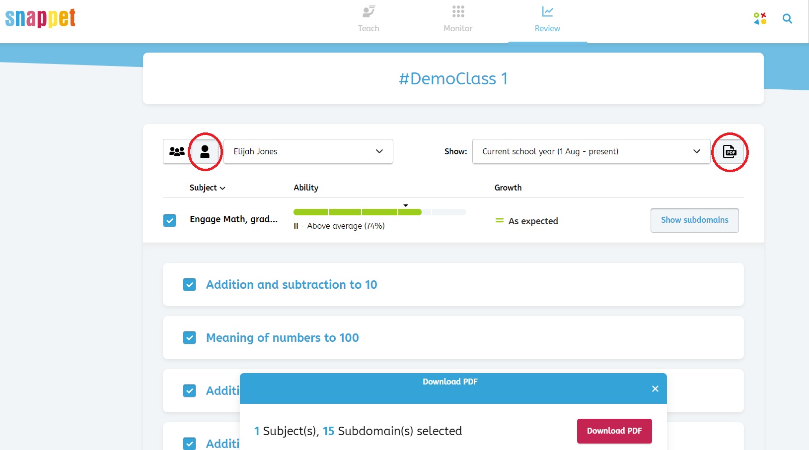For each student, you can generate a report with Snappet. This report can also be downloaded as a PDF-file.