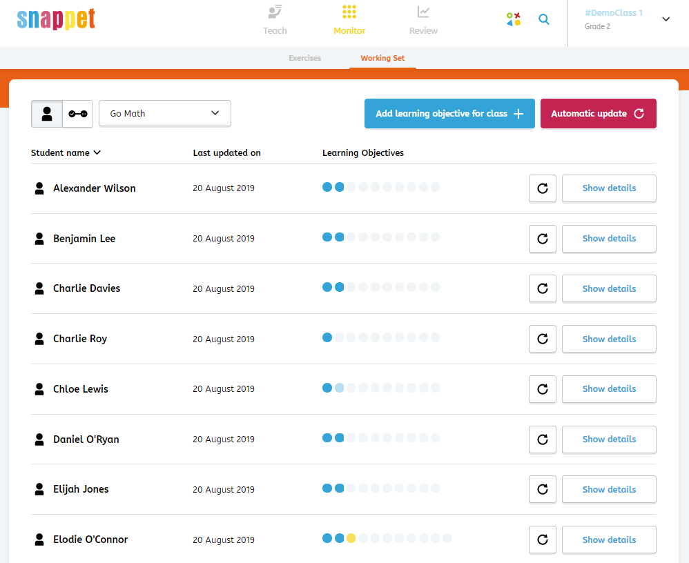 In the monitoring page, you will see a Working set submenu. This page can be used to monitor the status of your students on the learning objectives in their working set. You can use this page to monitor their progress; you can easily see whether they have reached their target (dark blue dot), still need to grow towards their target (light blue dot), need help (yellow dot) or have not done enough exercises (grey dot). This page also allows you to add additional learning objectives to the working set of specific students.